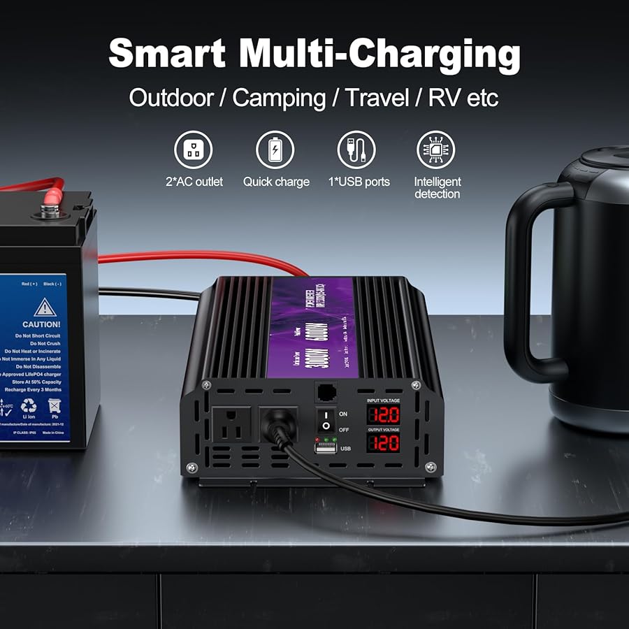 Is this power inverter suitable for outdoor activities?Yes, this power inverter is designed to be used in a variety of settings, including outdoor activities. Its robust design and ability to provide reliable power make it ideal for camping, road trips, and other outdoor adventures. Just ensure it is protected from extreme weather conditions and moisture to maintain its performance and longevity.