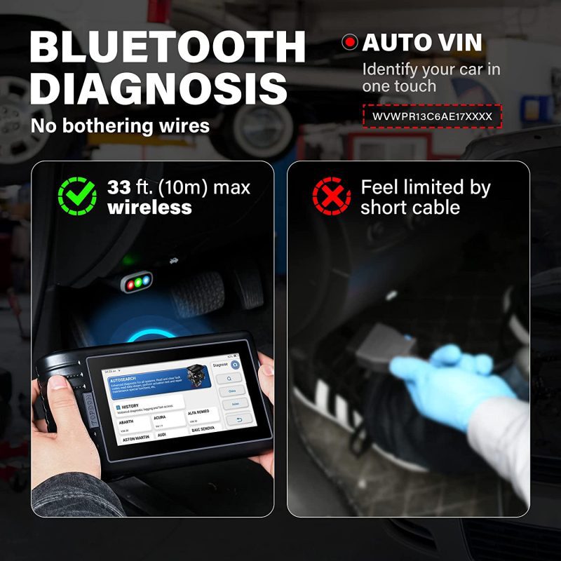 The tool offers wireless diagnostics within a 33 feet (10m) range, thanks to the included Bluetooth 4.0 VCI dongle. It can automatically identify a vehicle’s make, model, and year, and quickly match the right software with a single touch. It generates a full, clear, and accurate report for further analysis. *AutoVIN may not work on ALL cars. You can manually enter the VIN data if needed.