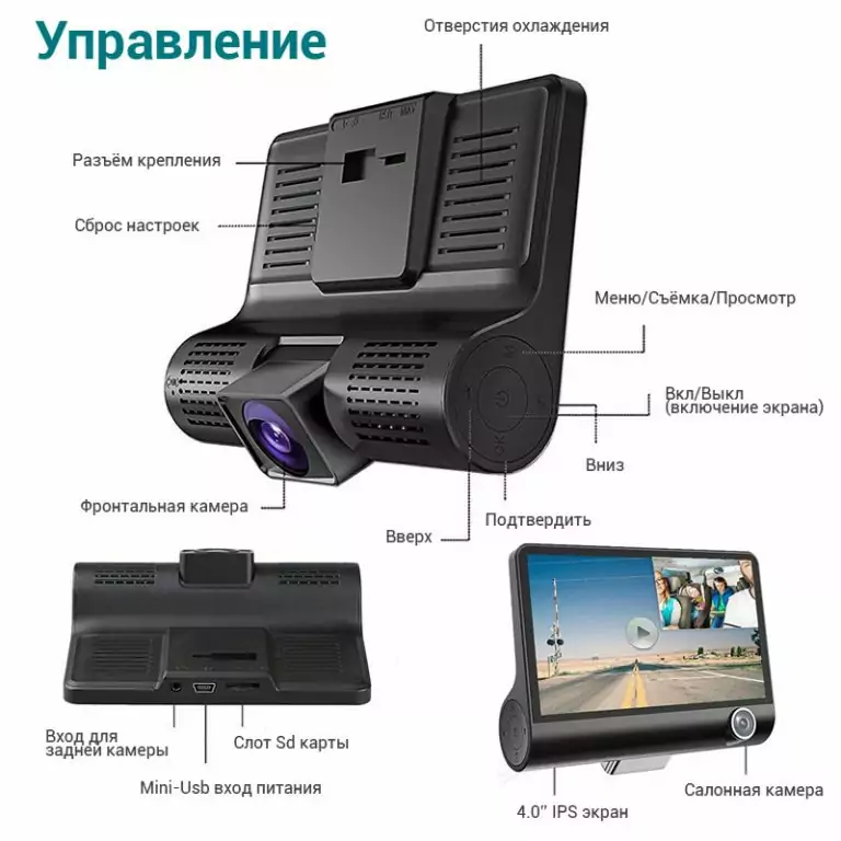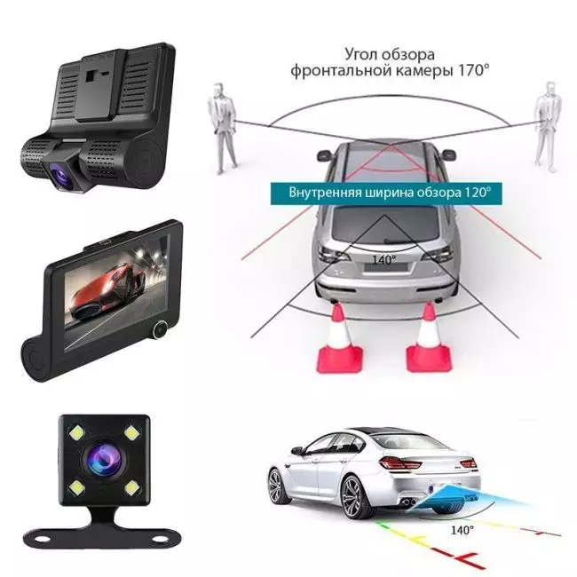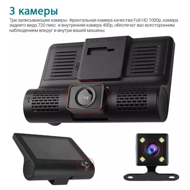 Данный трендовый видеорегистратор оснащён камерой заднего вида, встроенной фронтальной камерой и салонной. То есть двумя встроенными камерами + камера заднего вида.- Фронтальная камера (для записи ситуации впереди автомобиля), с углом обзора 140° и качеством записи 1080P при 30 кадрах в секунду.