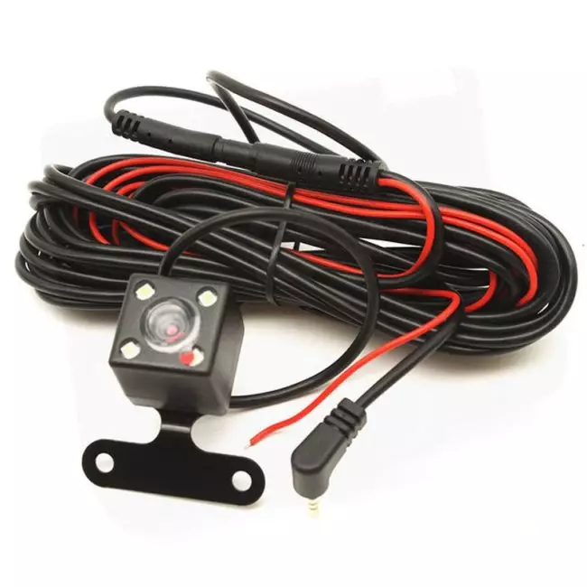 - Камера заднего вида (в комплекте удлиненный 6-метровый провод). Работает в качестве заднего видеорегистратора. Обладает такими же характеристиками, как салонная камера. Также задняя камера оснащена четырьмя встроенными инфракрасными светодиодами для улучшений ночного режима.