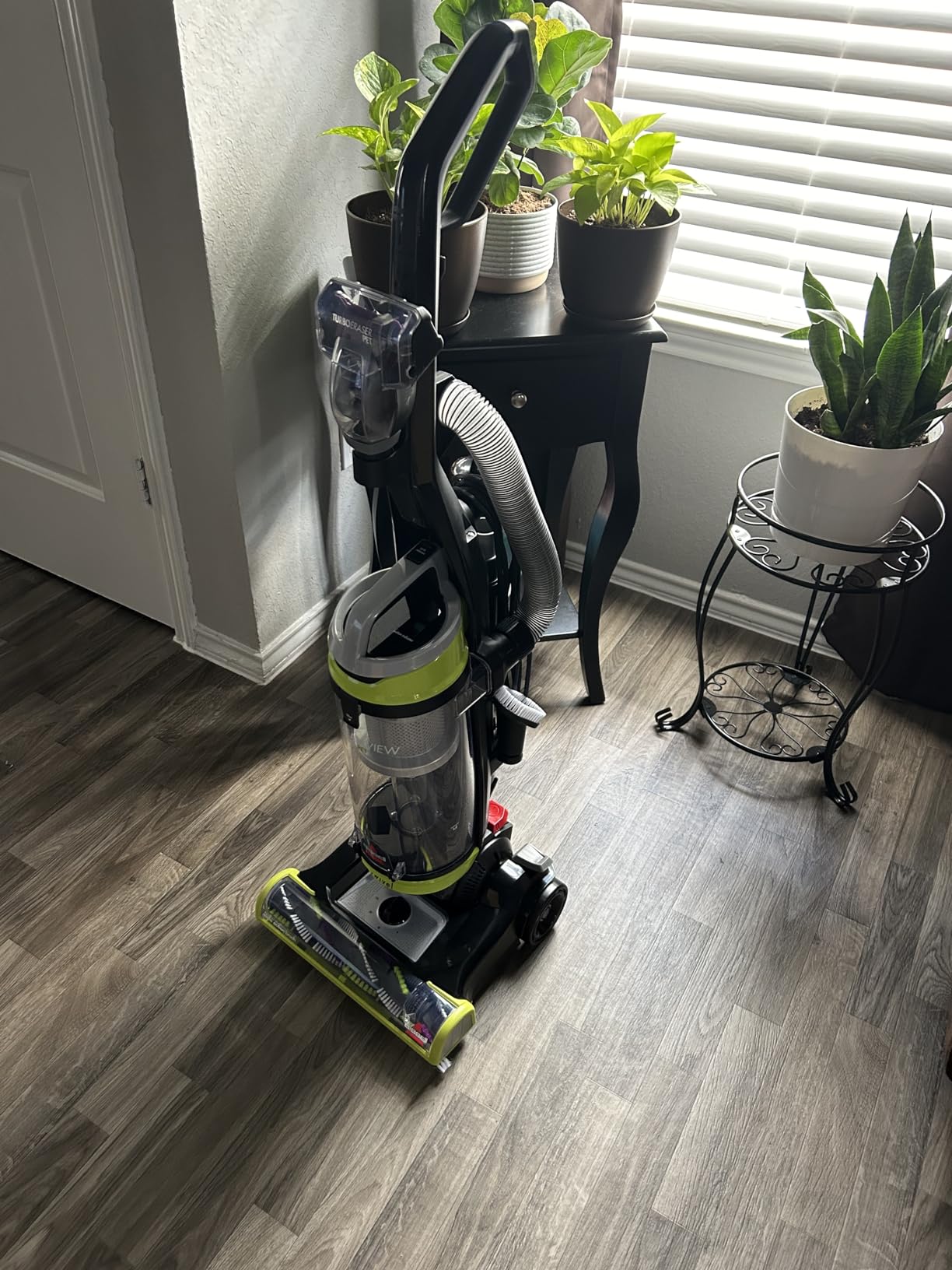The spinner thing never stops spinning-even once the hose is taken out to vacuum other parts such as blinds, baseboards, etc. the hose is also hella short and really inconvenient. But it does work great at vacuuming carpets and hardwood