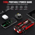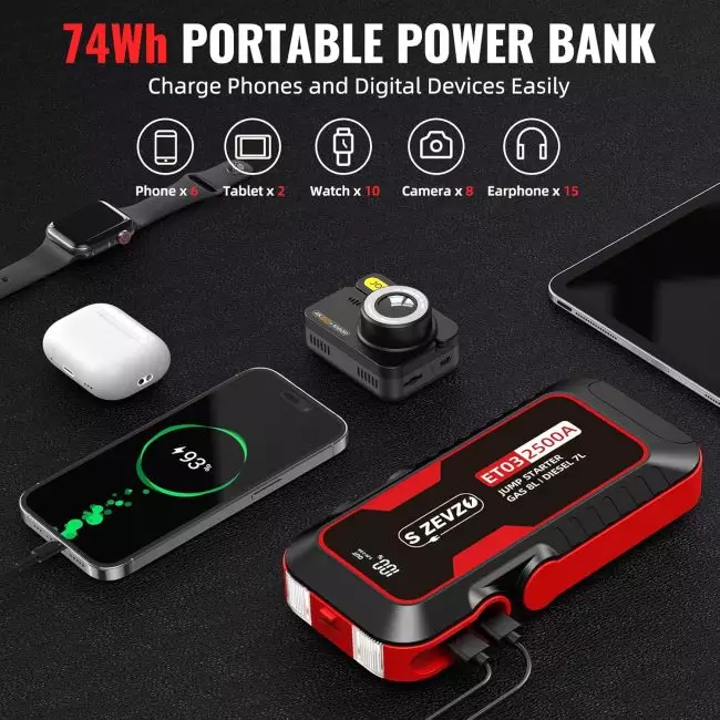 ZEVZO 74Wh portable power bank designed for charging multiple devices including smartphones, smartwatches, cameras, and tablets, with advanced capabilities like 2500A LUMI starter for gas and diesel engines up to 8L and 7L respectivelyVersatile 500-lumen LED flashlight with three lighting modes for outdoor adventures, emergency situations, and repair tasks