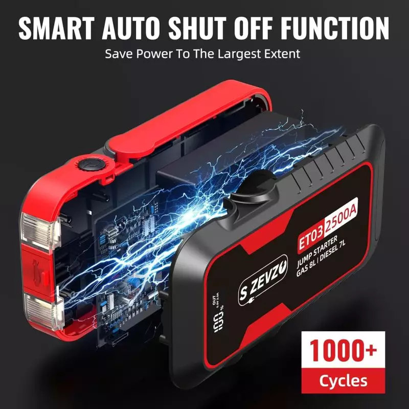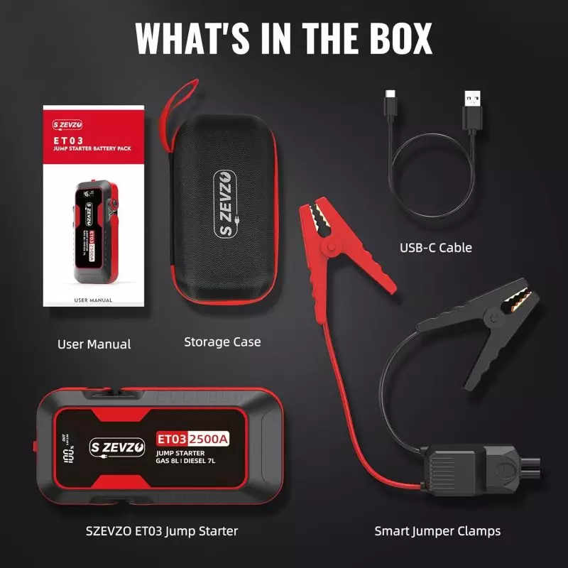 SZEZVO ET03 Jump Starter Battery Pack and accessories, designed for jump-starting gas engines up to 8.1L and diesel engines up to 7L, with a user manual, smart jumper clamps, USB-C cable, and storage case includedS ZEVZO ET03 portable car jump starter with 2500A peak current, long-lasting 24 months stand-by capability, designed for gas engines up to 8L and diesel engines up to 7L. Comes with jumper cable clamps.Durable S ZEVZO ET03 2500A portable jump starter; ideal for 8L gas and 7L diesel engines, featuring a smart auto shut-off mechanism and 1000+ cycle performance.