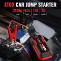 Portable ETO3 Car Jump Starter with 2500A peak current, supporting up to 50 starts for 8.0L gas and 7.0L diesel engines.