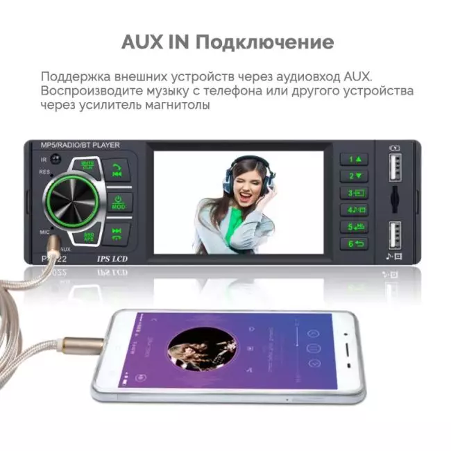 Два usb-порта (один – воспроизведение музыки, второй – поддержка быстрой зарядки телефона). А также слот для карты памяти формата MicroSD (TF card).