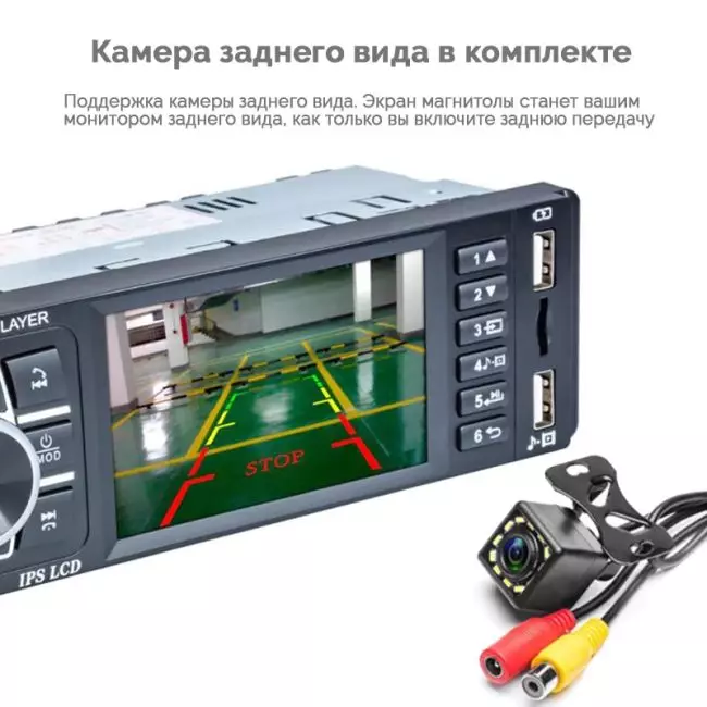 Вход для камеры заднего вида. Реверсивная камера заднего вида с 12 диодами и необходимым набором кабелей (6 метров) – в комплекте. Видео с задней камеры начинает отображаться на экране магнитолы при включении задней передачи.