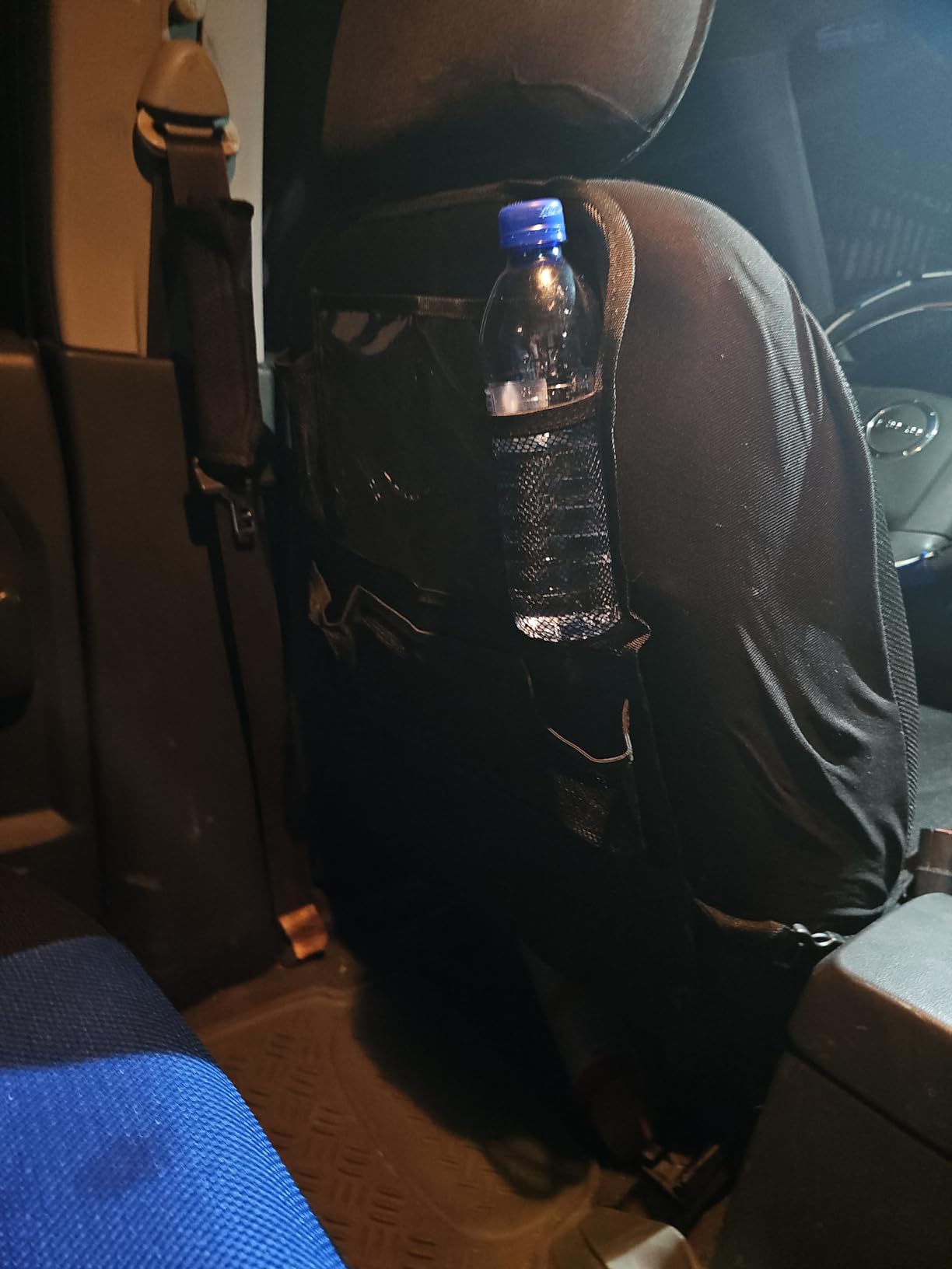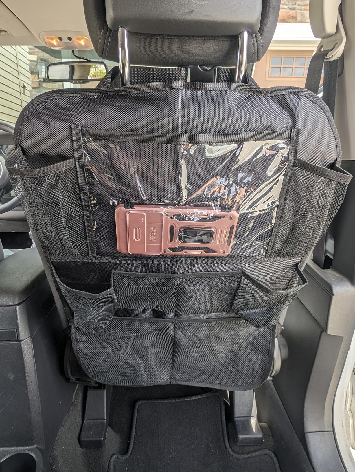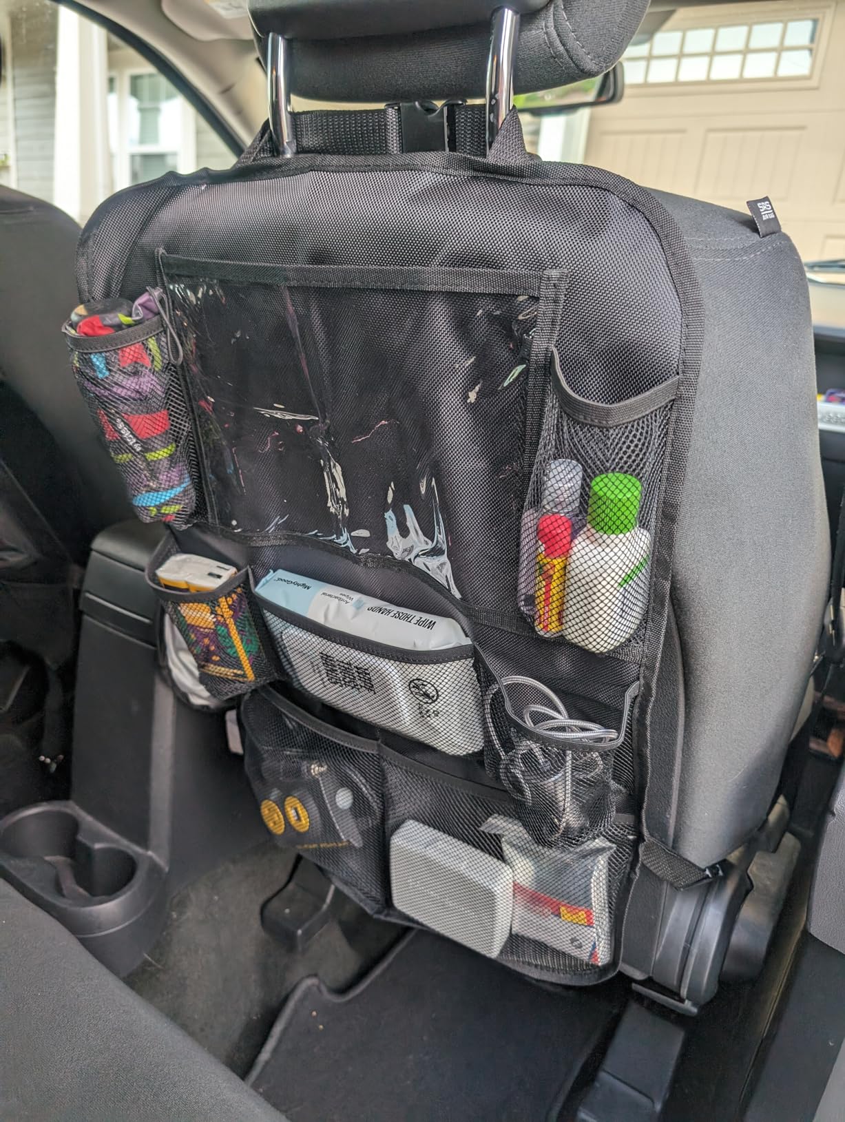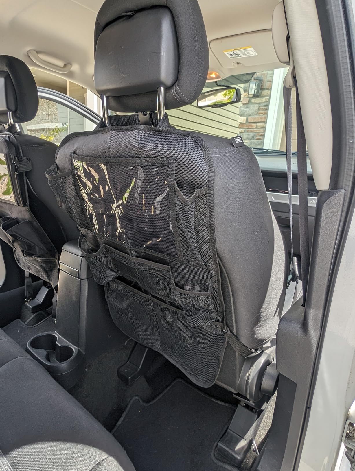 This fit nearly perfectly on the back of my seat for baby supplies on the go. My only qualm is the bottom strap doesn’t stretch too far to secure it without it sticking out on the driver’s seat. But it’s all we need and simple! I looked at many like this and am glad I went with this one. The clear plastic pocket is great for wipes/larger items that could leak etc. I though it was cool that the middle pockets have a little felt base that folds down so things don’t fall through the holes.