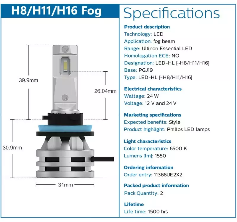 Philips Ultinon Essential G2 LED H1 H4 H7 H8 H11 H16 HB3 HB4 H1R2 9003 9005 9006 9012 6500K Car Fog Lamp (2 Pack)
