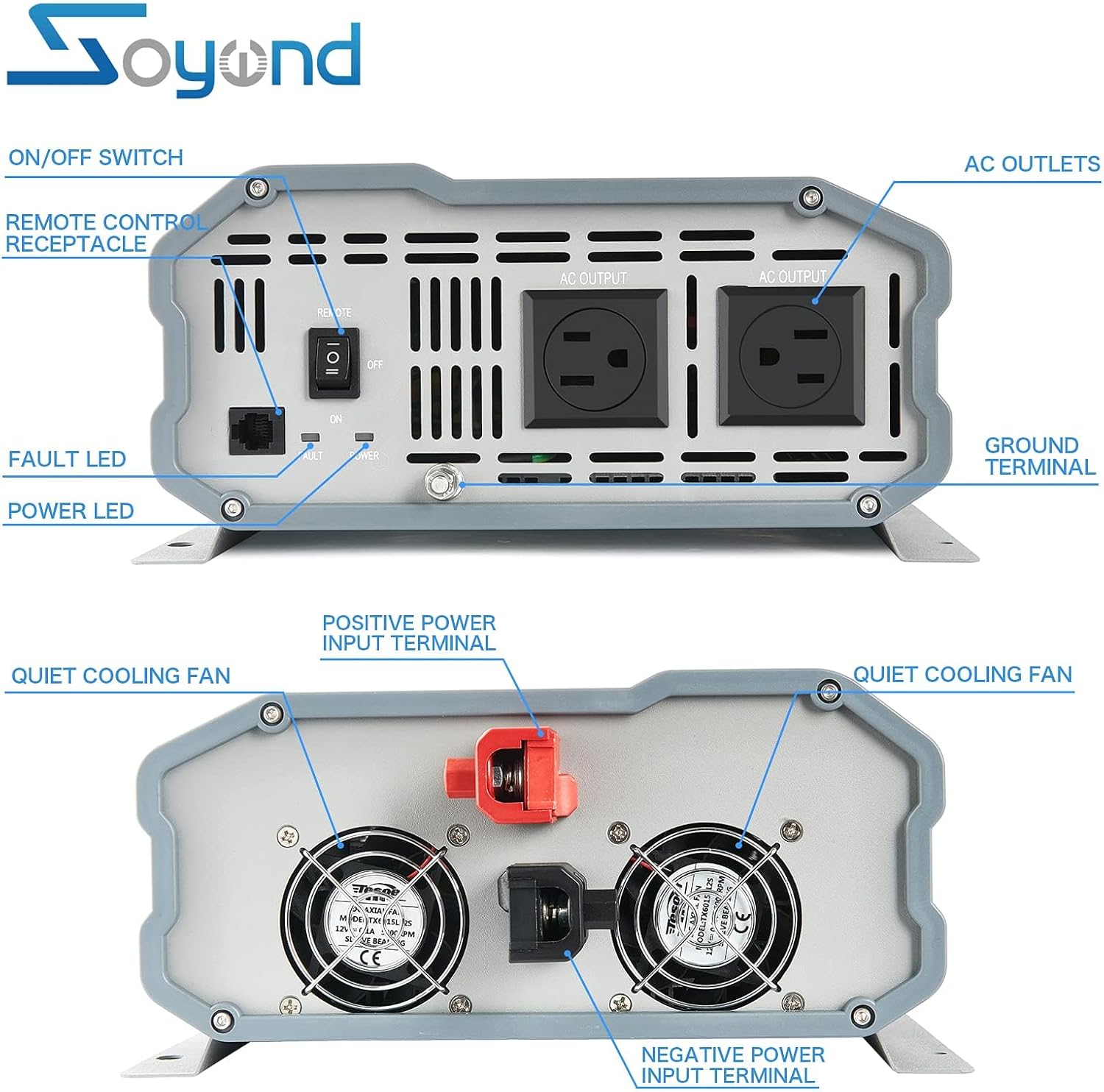 Power Inverter Pure Sine Wave 3000 watt,Soyond 12VDC to 120VAC Solar Inverter with Remote Controller(16FT) & Dual AC Outlets Off-Grid Power Inverter for RV Car Home Solar System Emergency