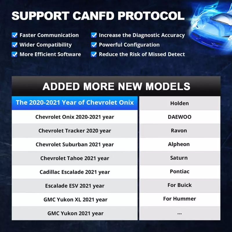 Thinkdiag2 automotive OBD2 scanner is the only product in this price range that is compatible with CAN-FD protocol and supports the latest GM vehicles manufactured after 2020. Adopts advanced CRC algorithms to accommodate more data from 8 to 64 bytes in the CAN frame, which runs faster than other products and reduces the risk of undetected errors to greatly enhance the user experience. Supports For Chevrolet Onix 2020-2021 year