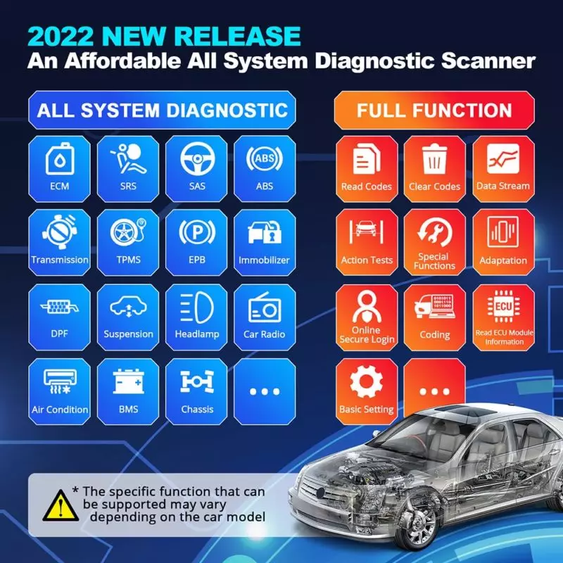 - Full System OE level functions :Read fault Codes For All System ,such as ECM, TCM, ABS, SRS, BCM, IMM, BMS, TPMS, SAS, Fuel System, Light System, Wiper System, etc.