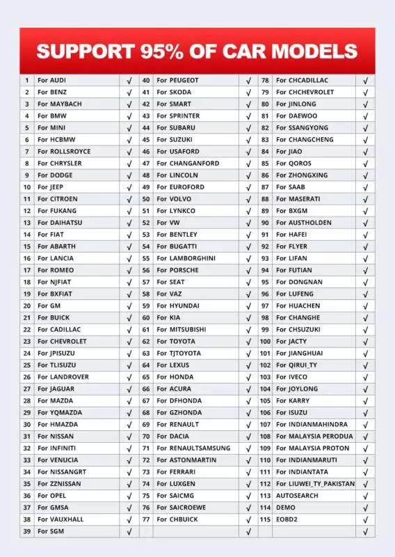 Support 95% Car Modles (Cover 115 Brands, and Counting) For OBDII diagnostics, the obd2 code reader works great for most cars built in 1996 or later, being compatible with following protocols: