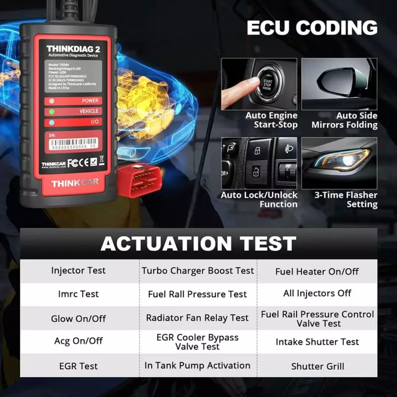 ECU Coding (Customize) Uses the ThinkDiag 2 App to customize the adaptive data for vehicle control modules, after repairs or replacements of lorry parts consisting of: [ Power Window | Illuminated Entry | Warning | Light Control | Slide Roof | Air Conditioner | Display | Unit Conversion | Entry & Start | PSD & PBD Operation | Seat … ] Active Test (Bi-directional control) Uses the ThinkDiag 2 App to test if the actuator is regular, without using the automobile’s controls, to get a substantial boost in effectiveness [ Turn on the radiator fan | Modulate the throttle | Open/close windows | Operate mirrors | Turn on/off the lights | Turn on/off the sound horn | Test door lock … ]