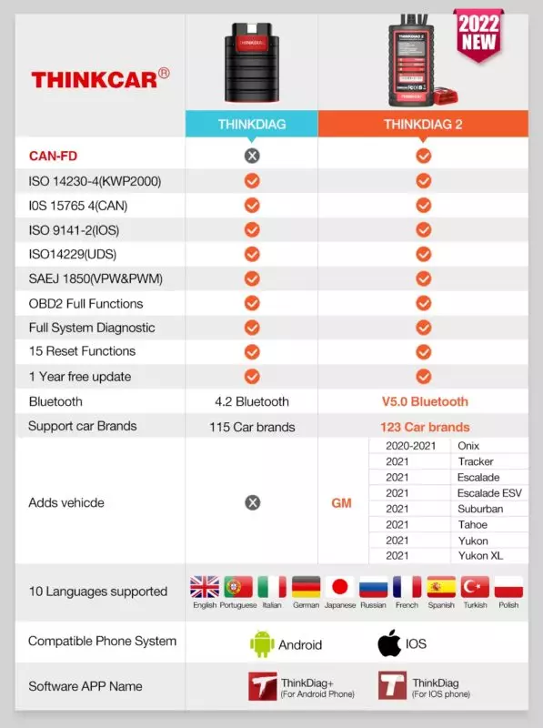 THINKCAR THINKDIAG 2 Language : English , French , Spanish , German , Portugese , Italian , Japanese , Russian , Polish , Turkish .