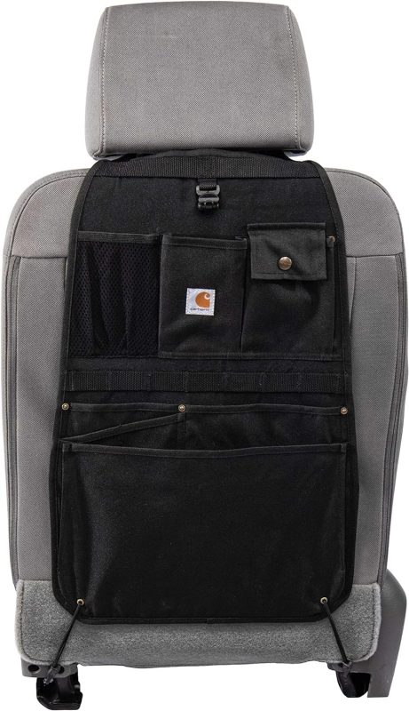 - Enhance Car Storage with a Seat Back Organizer: Discover the efficiency of Carhartt’s Universal Seat Back Organizer, designed to offer robust storage solutions. With its attachment to the rear of a car seat, it provides a multi-pocket system made from the brand’s renowned durable material, ensuring your essentials are well-organized during your travels.