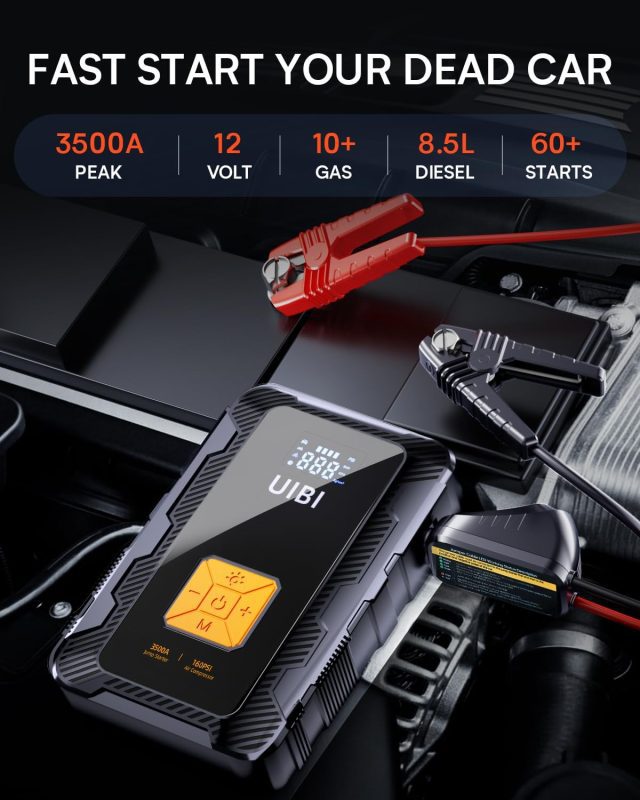 Jump Starter with Air Compressor UIBI 3500A, 160PSI Tire Inflator, Type-C, 12V for 10L Gas/8.5L Diesel