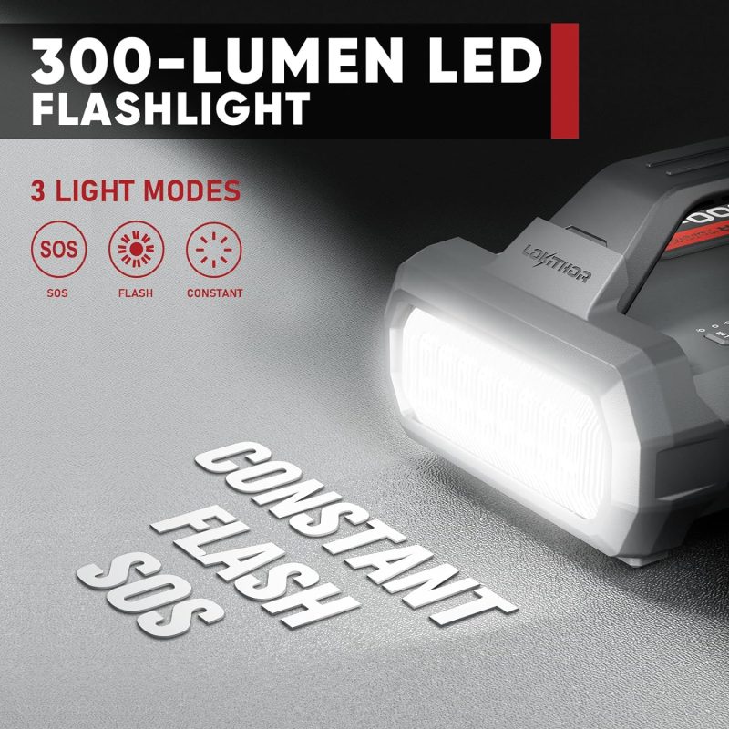 - Features multiple utility functions including a 300-lumen LED flashlight with different modes