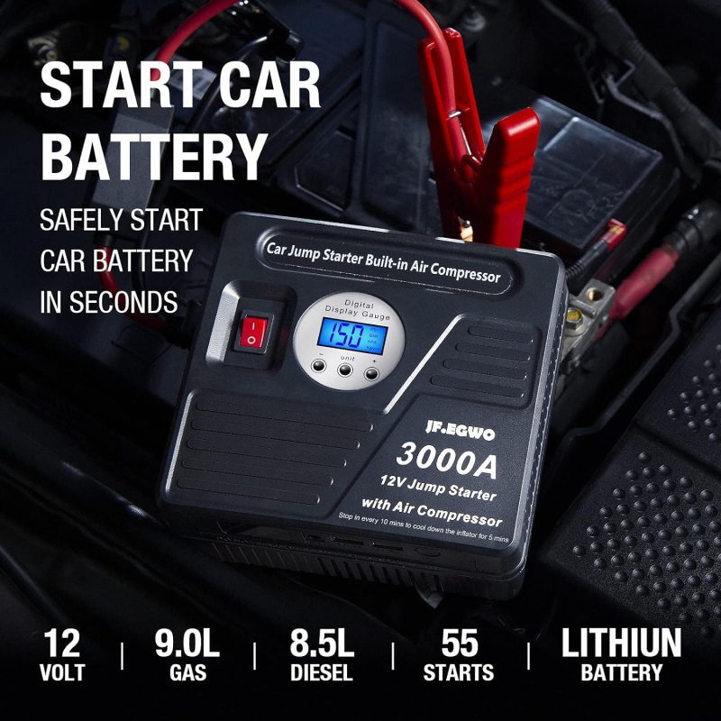 | JF.EGWO 3000Amp Car Jump Starter with Air Compressor | JF.EGWO | 4.5 out of 5 stars | 3000Amp jump start; 150PSI air compressor | Super capacity and peak, built-in 150psi air compressor, automatic stop and LCD screen, USB ports, emergency light | $129.99 |